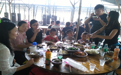 一起分享集體協(xié)作的成果,雞,魚,蝦,排骨等等,對了,還有餃子,像魔法一樣呈現(xiàn)在大家面前,話不多說,趕緊大快朵頤,下午還有更精彩的行程等著我們!