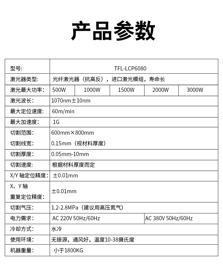 | 激光器最大功率 | 500W | 1000W | 1500W | 2000w | 3000W |