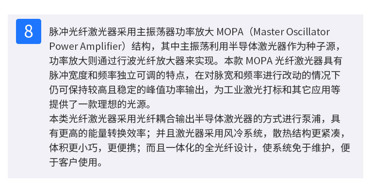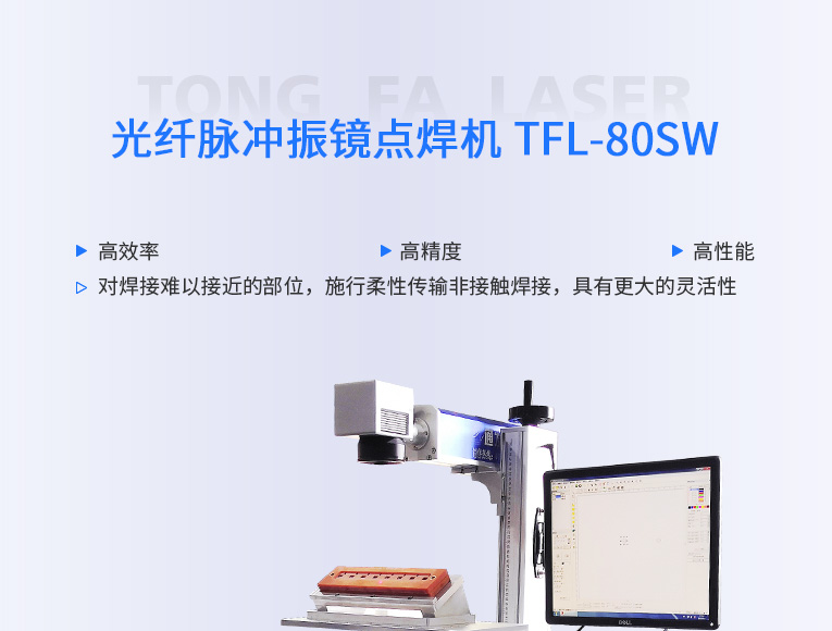 通發(fā)激光TFL-80SW振鏡激光焊接機(jī),采用主振蕩器功率放大 MOPA(Masrer Qscillator Power Amplifier)結(jié)構(gòu),實(shí)現(xiàn)脈沖寬度和頻率獨(dú)立可調(diào)的特點(diǎn),在對脈寬和頻率進(jìn)行改動(dòng)的情況下仍保持較高且穩(wěn)定的峰值功率輸出,適用于電池、小五金等多個(gè)行業(yè)的激光打標(biāo)、激光焊接應(yīng)用。